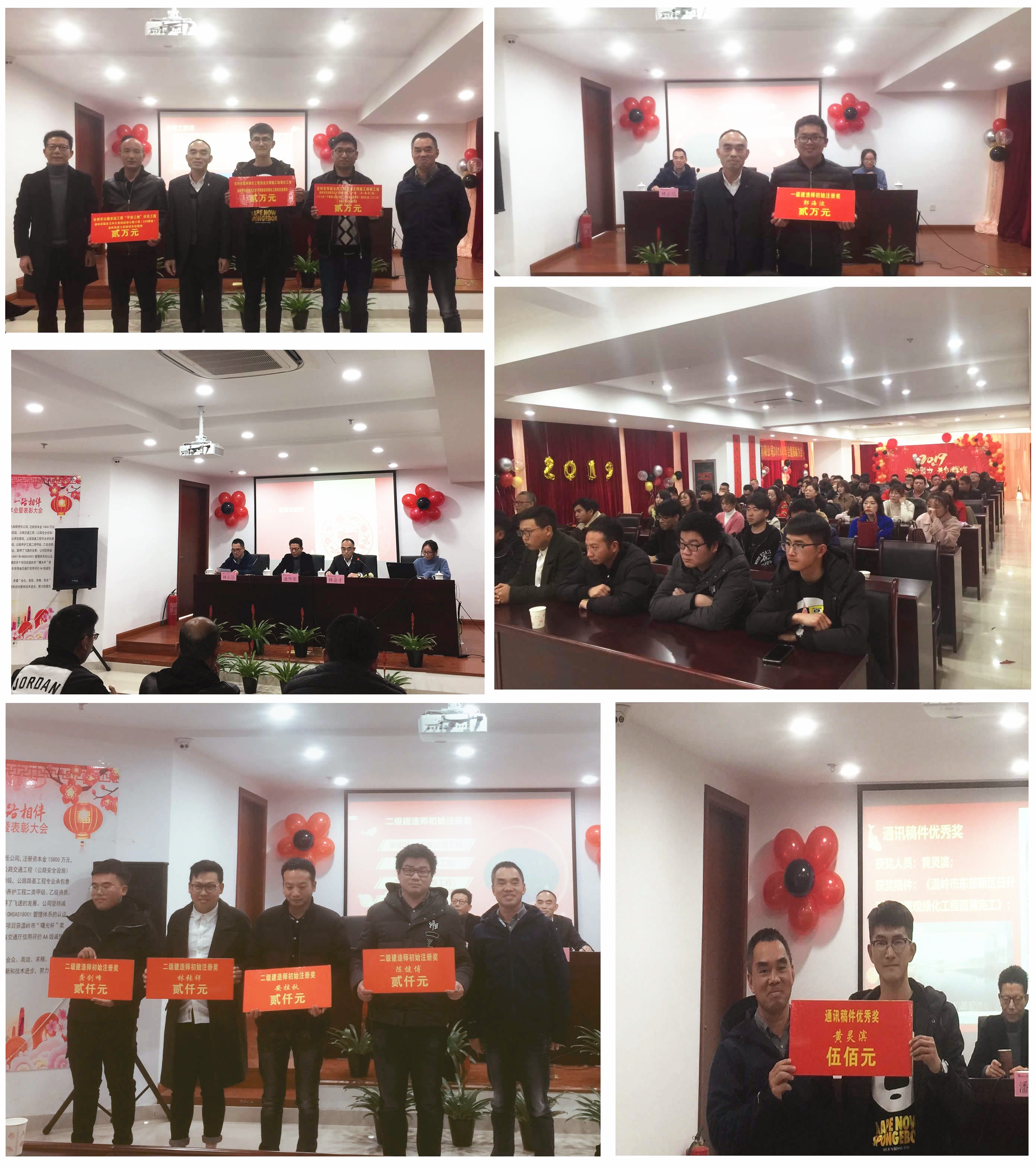下午3时许,大会在主持人金主任的新春祝福中拉开了序幕。大会先由公司董事长林金才引领发言。林董全面总结了公司2018年所取得的成果,对于全体员工在过去一年中作出的努力和贡献给予了充分的肯定和赞扬;同时林董也展望了2019年,未来充满机遇和挑战,我们要做好准备,迎接挑战,坚实走好公司发展的每一步道路。接着,潘局长为年会致辞。潘局长在发言中肯定了我司在温岭交通建设中所作出的贡献,对我司全体员工提出了“众志成城、一往无前”的美好愿景。最后,领导们为优秀工程奖获奖集体、一级和二级建造师初始注册奖以及通讯稿件优秀奖获奖个人颁奖并合影留念。