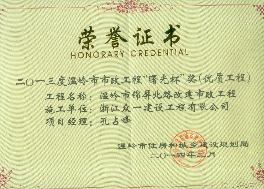 根据温岭市住房和城乡建设规划局文件---温建规[2014]33号,由我司(浙江众一建设工程有限公司)施工的“温岭市锦屏北路改建市政工程”荣获“2013年度温岭市市政工程曙光杯奖(优质工程)”。该工程项目西起塔下公园下桥头,东至万昌路交叉口,全长401.47m,宽度30m,施工范围包括道路、排水、标线三个工程。
