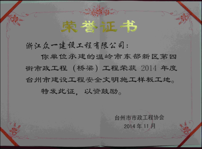 根据台州市建筑业行业协会文件----台建协[2014]24号,由我公司(浙江众一建设工程有限公司)承建的温岭市东部新区第四街市政工程(桥梁工程)荣获“2014年度台州市建设工程安全文明施工样板工地”称号。