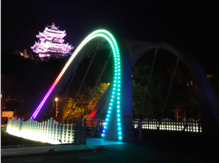 前溪桥桥梁标高的提高,更有利于泄洪排涝。其亮化配套工程,采用上下照射壁灯点缀,由点光源和灯带组成,色彩时时变化,并与周边的东辉阁亮化、前溪沿河亮化融为一体,共同构成一道亮丽的风景线,扮靓城区夜景。